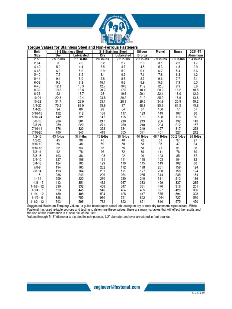 Torque Values for Stainless Steel and NonFerrous Fasteners